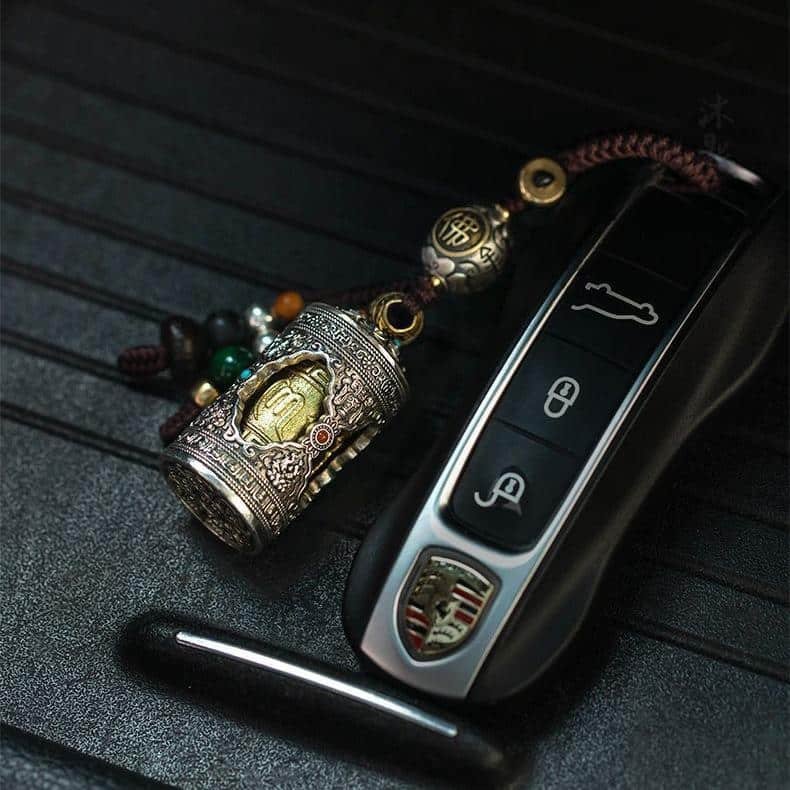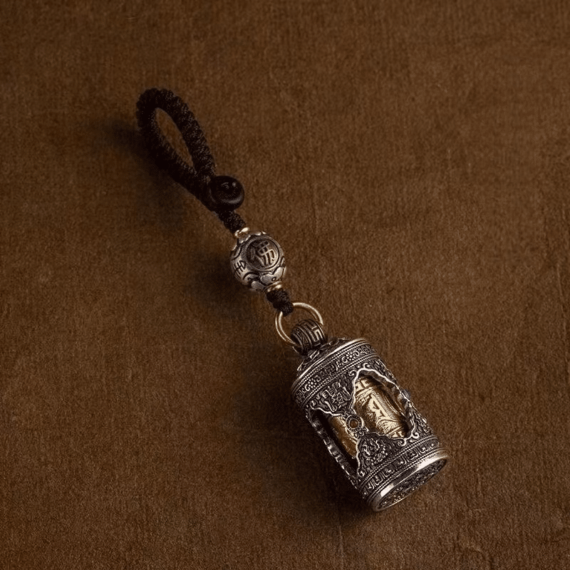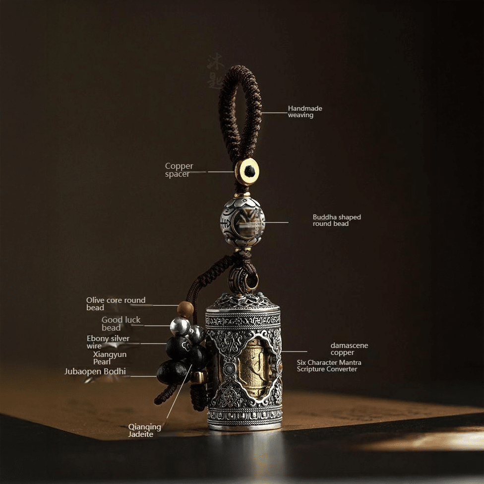 Inspired by the cosmic axis of Mount Kailash, this handcrafted keychain brings together timeless Tibetan artistry and modern function. The center features a rotatable prayer wheel, delicately engraved with the Six-Syllable Mantra (Om Mani Padme Hum)—each spin, a silent invocation for peace, clarity, and compassion.